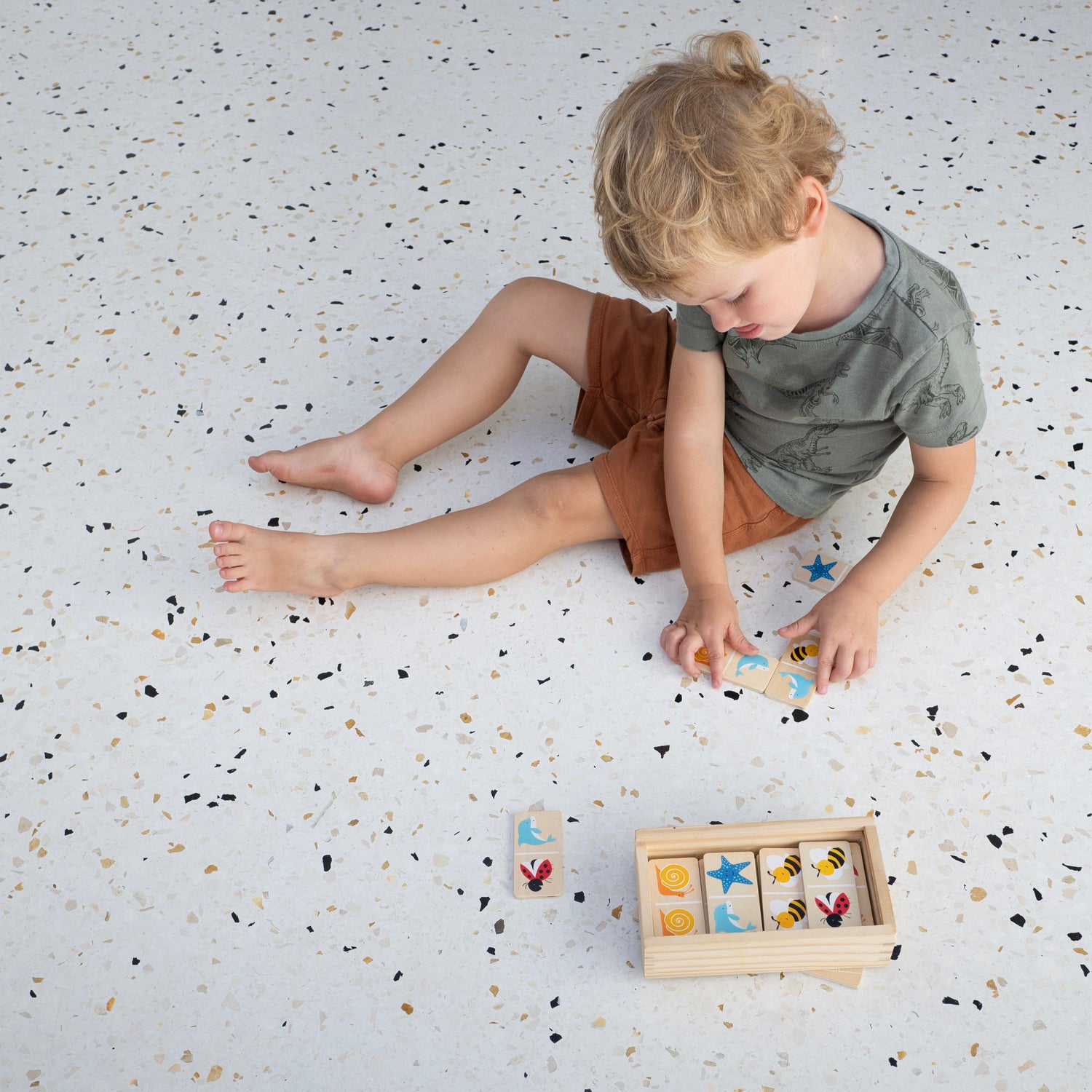 Terrazzo is een veelzijdig en tijdloos materiaal dat zowel stijl als functionaliteit combineert. Het materiaal bestaat uit siergranulaten, glas of uit andere steensoorten gebonden met cement. Na uitharding wordt de tafel geschuurd waardoor de binnenkant van het siergranulaat zichtbaar wordt.