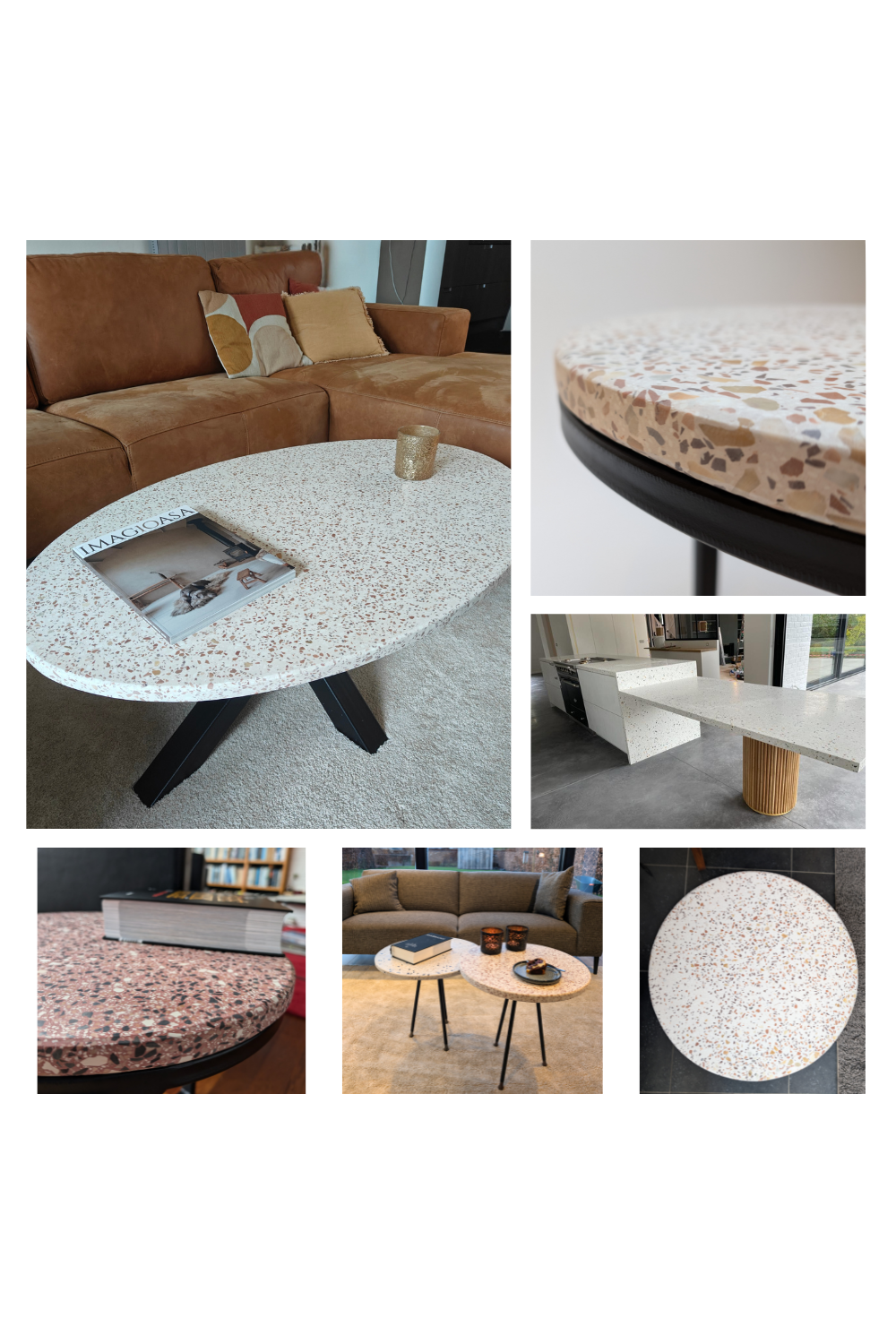 Of je nu een strak en modern interieur wilt of juist een warme, klassieke uitstraling, terrazzo biedt vele mogelijkheden. Dit unieke materiaal kan op maat worden gemaakt in verschillende kleuren, patronen en afwerkingen. Vraag zeker na wat de verschillende mogelijkheden zijn. We ontwerpen samen met jou de perfecte tafel voor jouw interieur!